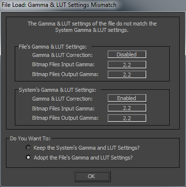Open. The File Load: Gamma & LUT Settings Mismatch dialog appears.