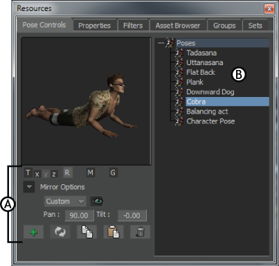 You can also save selected poses and build a library of poses for pasting onto characters when needed. All the poses in the Pose browser also appear in the Poses group in the Scene browser of the Navigator window.