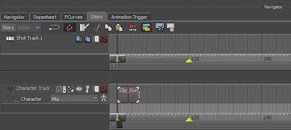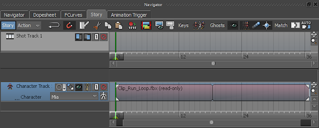 After framing the Clip_Run_Loop.fbx clip, the Character Track is highlighted in blue indicating it is selected, and the Clip_Run_Loop.fbx clip is no longer shown as being selected.