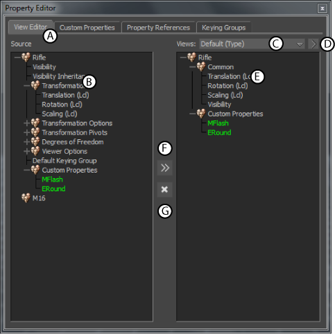 Properties Editor A. View Editor pane B. Source area C. View menu D. View Options button E. View area F. Add button G. Remove button