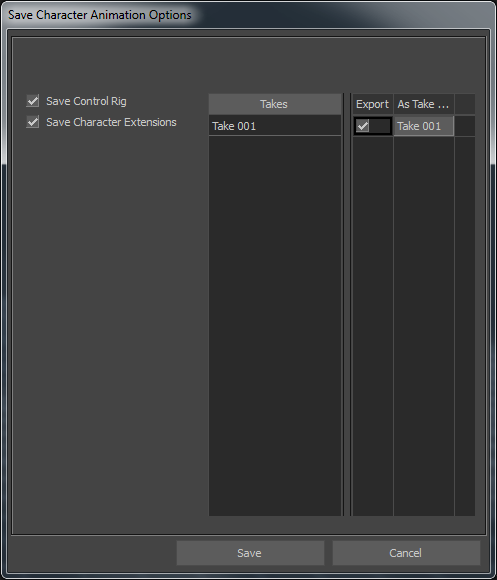 - In the Save Character Animation Options dialog, ensure the Save Control Rig option and the Save Character Extensions option are activated before you click Save.