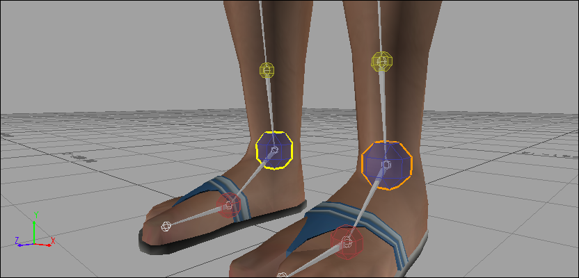 In addition to the cells representing IK effectors, the Character representation displays Auxiliary effectors and pivots, which are Auxiliary objects that provide another level of IK control. You can create up to fourteen Auxiliary objects for each IK effector on a Control rig.