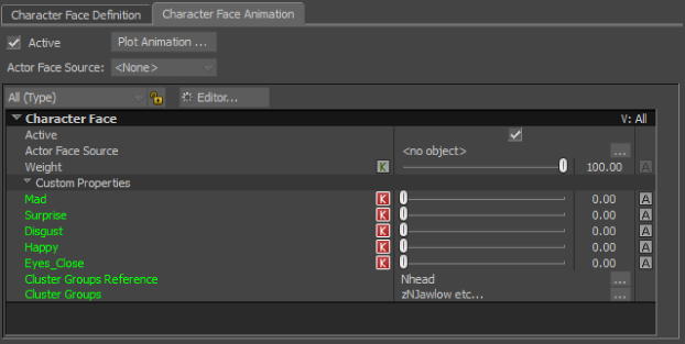 To activate and constrain the Character Face to either an Actor Face or plotted animation, enable the Active option. You can also enable the Active option in the Character Face Definition pane.