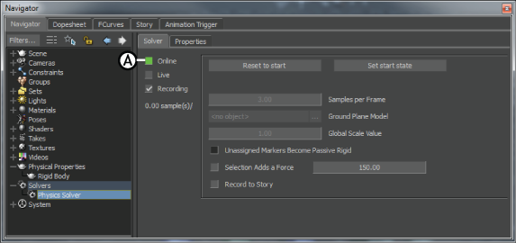 Note: If you modify properties in the Solver or the Rigid Body, switch the Solver offline, and then switch back online to have your changes recognized. You cannot add Physical properties (for example Rigid Body, Ragdoll or Joint) to objects while the Physics solver is online.