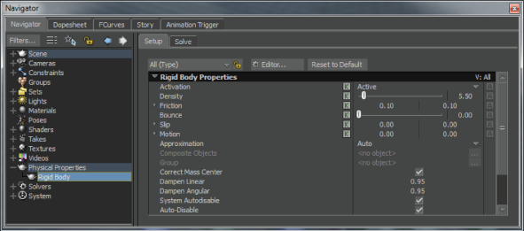 - In the Navigator window Scene browser, expand the Physical Properties folder and double-click the Rigid Body Physical property.