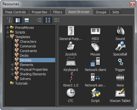 In the Asset browser, the Device folder contains software or hardware components used for animating. These devices are either input devices, output devices or both—input and output devices.