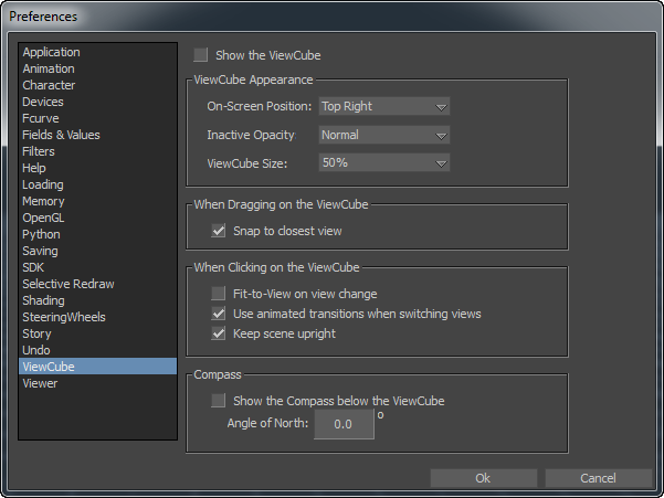 The Compass preference settings lets you indicate which direction is defined as North for the scene. The ViewCube compass North direction is based on the North and Up directions defined by the scene or set in the Angle of North field. The following table describes the Compass preference settings.