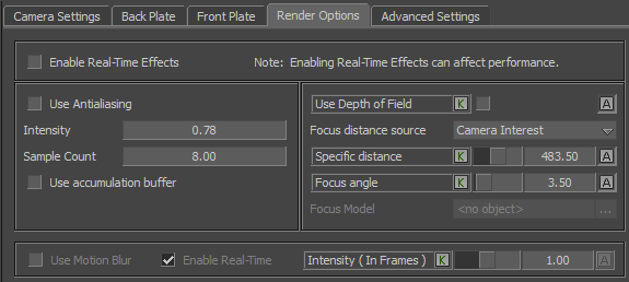 The Render Options pane lets you set the Anti-aliasing, depth of field, and other rendering related options for the selected camera.
