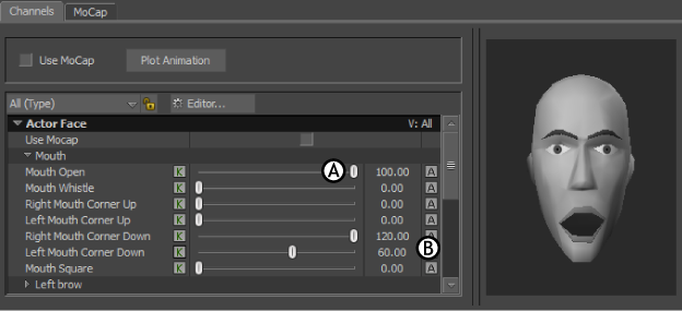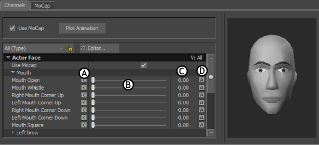 Actor Settings, Channels pane A. Keyframe (K) button B. Channel slider C. Value field D. Animate (A) option