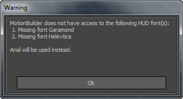 This dialog box lists the fonts that are unavailable and informs which font is used, instead. At first, MotionBuilder checks for the availability of the (default) Arial font. If the Arial font is not available, then it checks for the availability of the following fonts in the given order and uses them if available: