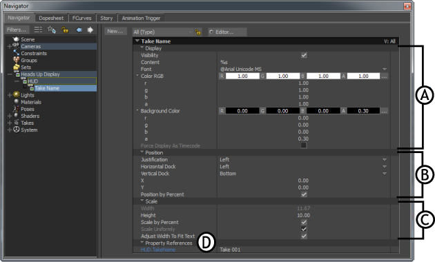 The properties of HUD element are useful to modify the appearance, position, and size of the content it displays in the Viewer. When you click a HUD element under a HUD asset, the element properties appear in the right pane of the Navigator window.