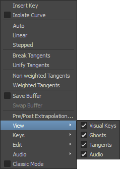 The options in the View menu allow you to view or hide visual keyframes, Ghost curves, all keyframe tangents, and audio on the FCurve timeline.