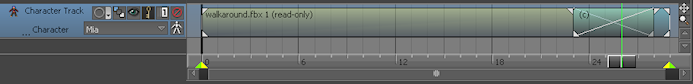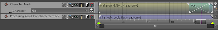 In the Story window, a second Character Track (Processing Result for Character Track) appears containing the new mia_walk_cycle.fbx clip.