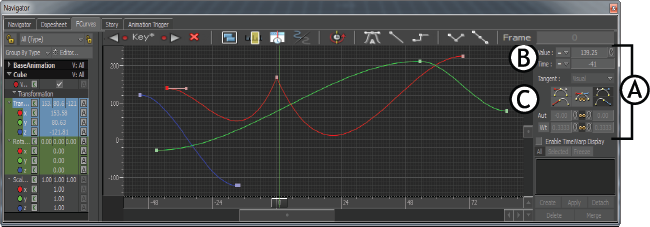 FCurves window A. FCurves Options pane B. Value and Time settings C. Tangent area