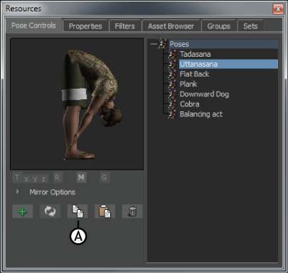This action copies the pose to memory, replacing any previously copied pose. Clicking Copy also deselects any selected poses in the Pose browser.