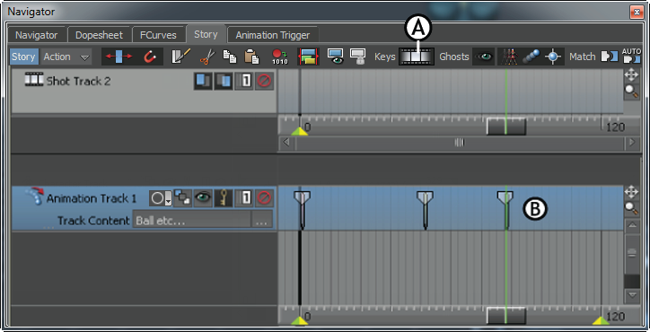 Story window A. Multiple Clips option set to active B. Clips created for keyframes at frame 0, 49, and 81