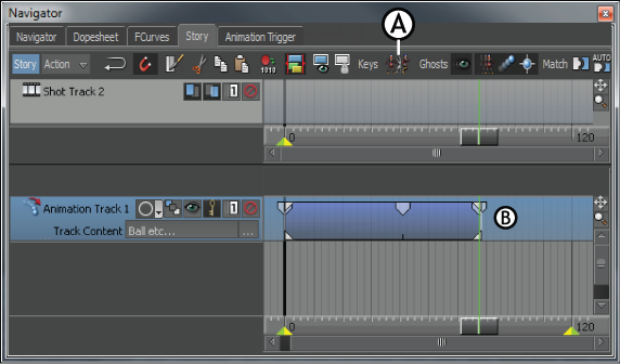 Story window A. Multiple Clips option disabled B. Clip encompassing keyframes at frame 0, 49, and 81