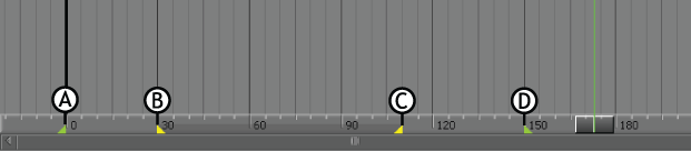 - In the Story window, drag the green markers at the bottom of the Action Track list. The green markers indicate the start and end of the take (A and D) and correspond with the Start and End fields in the Transport Controls window.