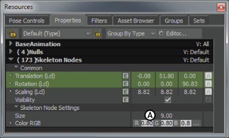 Properties window A. Skeleton Node Settings, Size property
