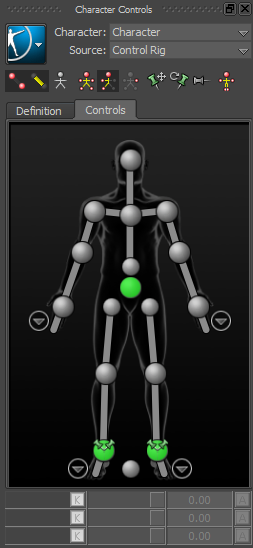 In the Character Controls window, the Control Rig settings are activated and include all the effectors you need to animate the Control rig.