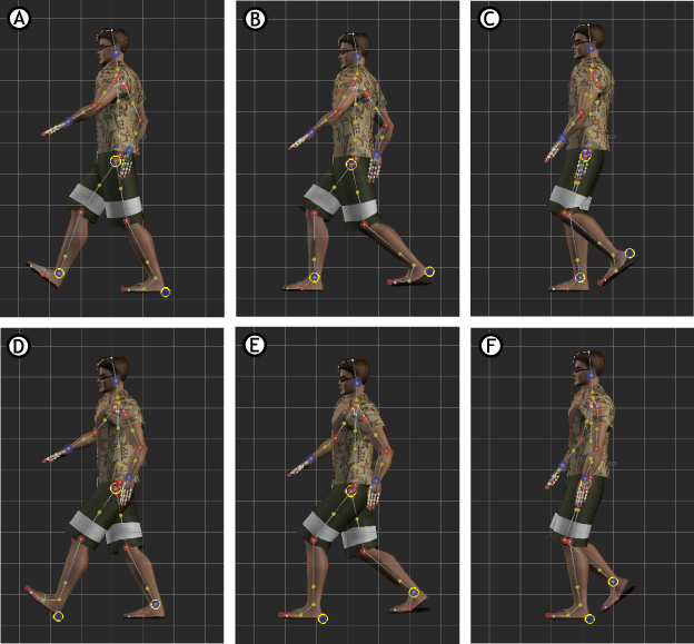 Poses in a keyframe animation cycle A. Frame 0 B. Frame 5 C. Frame 10 D. Frame 15 E. Frame 20 F. Frame 25