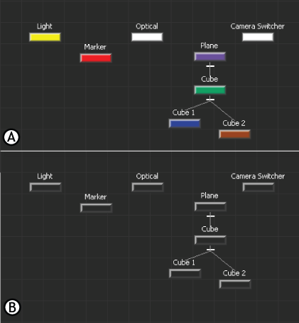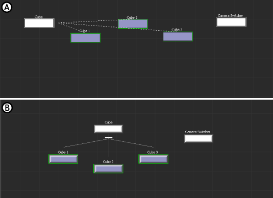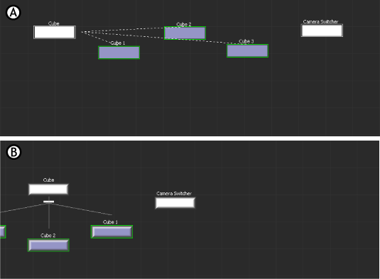 Auto Arrange is disabled. A. Cube 1, Cube 2, and Cube 3 are constrained to Cube. B. The child nodes move underneath the parent node, and do not display fully in the Viewer window.