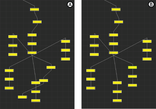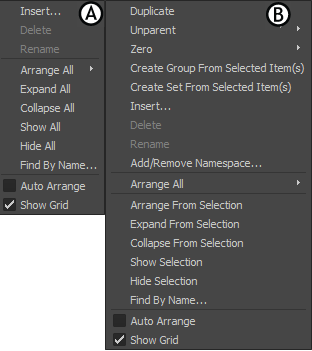 Schematic view context menus A. Menu available when right-clicking an empty space B. Menu available when one or more than one node is selected and you right-click