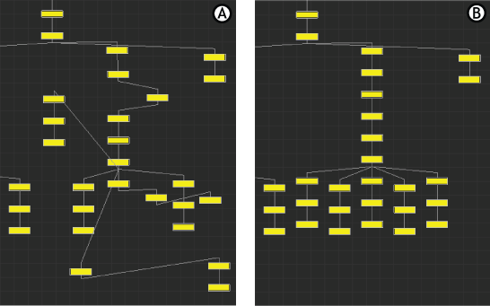 A. Disorganized hierarchy displayed B. Arrange All is activated