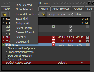 You can mute and unmute animated Transformation properties and channels similarly to locking and unlocking Transformation properties and channels to prevent any changes to the animation from happening on the selected property or channel. When an animated Transformation property or channel is muted, its current value becomes the static value for this property or channel.