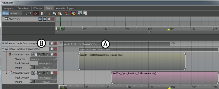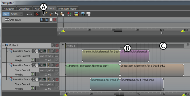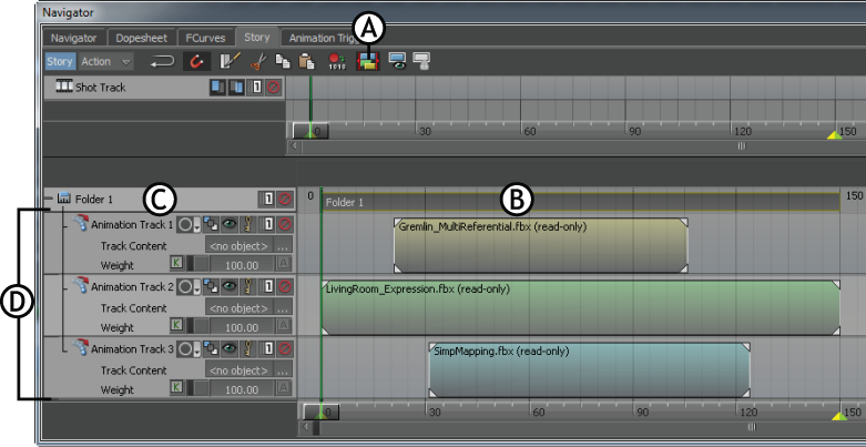 Story window A. Summary Clips On/Off icon B. Summary clip C. Folder D. Tracks and clips within the folder