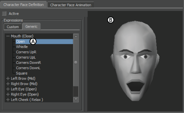 Generic expression A. Mouth Open generic expression B. Expression displayed in the Preview pane