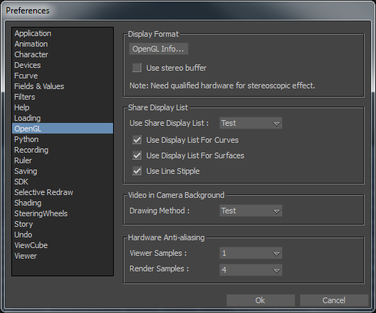 The Display Format includes OpenGL Viewer Info settings and the ability to use stereo buffer for stereoscopic effect. See OpenGL Viewer Info window.