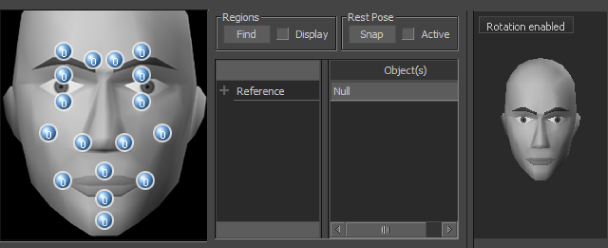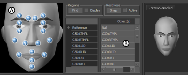 After you have loaded facial motion data in the scene, added an Actor face, and defined a Reference object, you can create a facial Marker set.