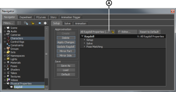 The Ragdoll Property options display along the top of the Ragdoll Setup pane. These Property options are the View menu and Lock option, the Editor button, and the Reset to Default button to restore the Ragdoll properties to their original settings.