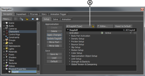Ragdoll Setup pane A. All Ragdoll Properties (Type)