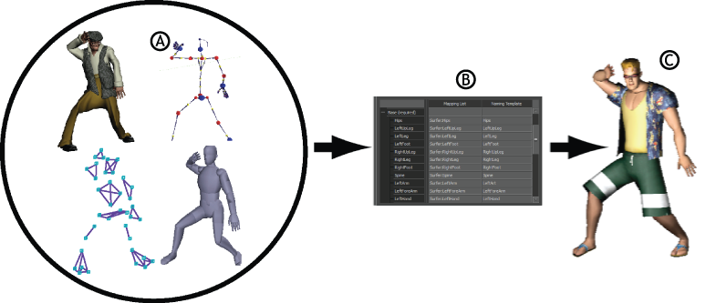 Motion source data flow A. Motion sources B. Character asset C. Animated character model