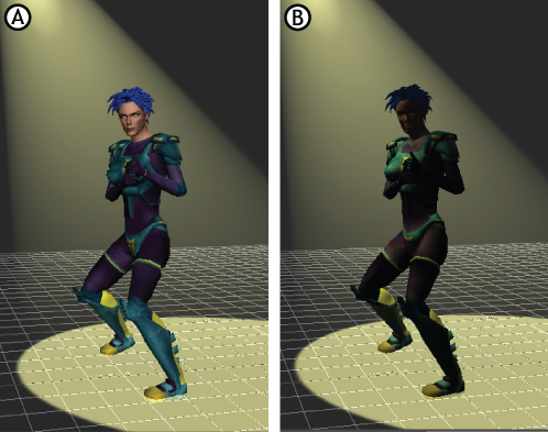 When you add a light, it is a Point light by default and the Global (ambient) light is extinguished. For example, the following figure shows the scene illuminated using the default Global light (A) and an added Point light (B).