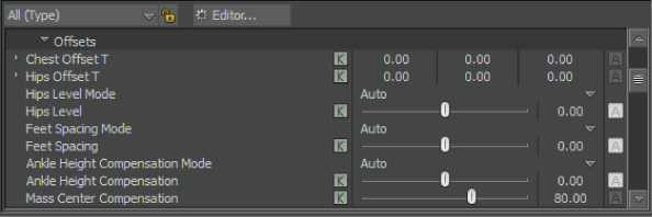 | Hips Level | Lets you control the level of the hips relative to its center of gravity. You can select User, Off, and Auto options from the Hips Level Mode menu. |