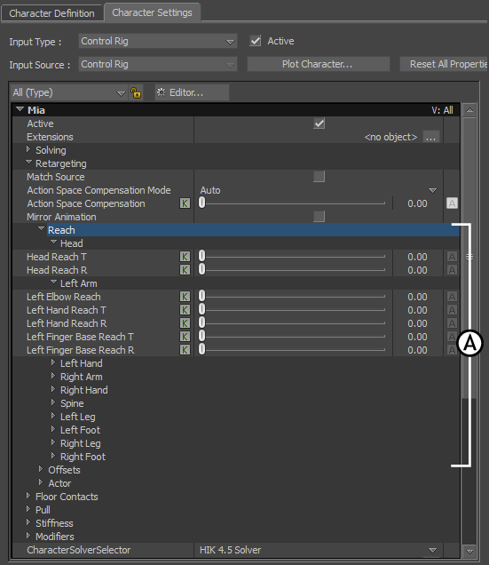 Character Settings pane A. Retargeting > Reach settings