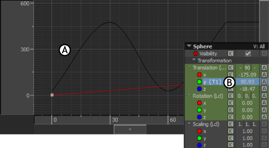 Once the TimeWarp curve is applied, its reference number appears next to the name of the property in the FCurves Properties pane. A black curve shows how the TimeWarp curve affects the function curve for the selected property.
