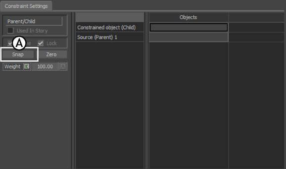 - Click Snap to create an offset between the position, rotation, or scale of the constraint and the current position of the object being constrained.