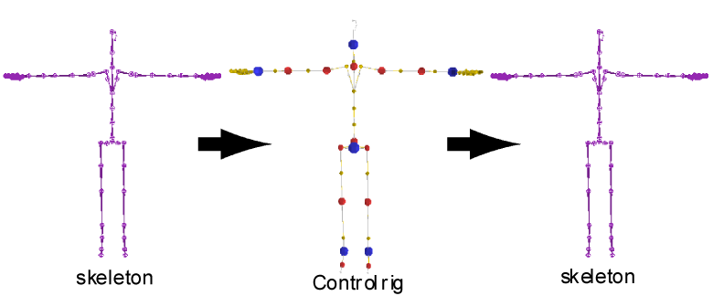 When you are finished creating or modifying the animation on the Control rig, before you save, you can plot the animation back to the model’s skeleton as shown in the following figure. This prepares your animation data to be exported so you can work with it in other software packages.
