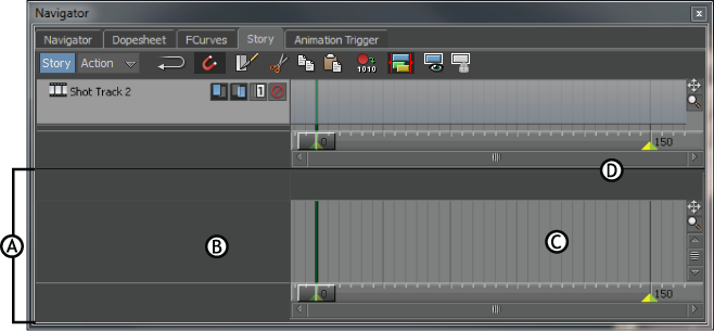 Story window A. Action Track list B. Action Track controls area C. Action Clip area D. Resizing bar