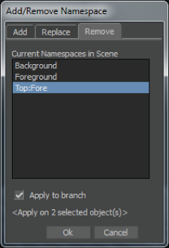 The Add/Remove Namespace dialog box appears, displaying in numeric alpha order the namespaces in the scene.