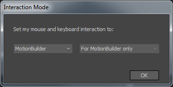 When you first launch MotionBuilder, the Interaction Mode window displays, enabling you to specify a keyboard set.