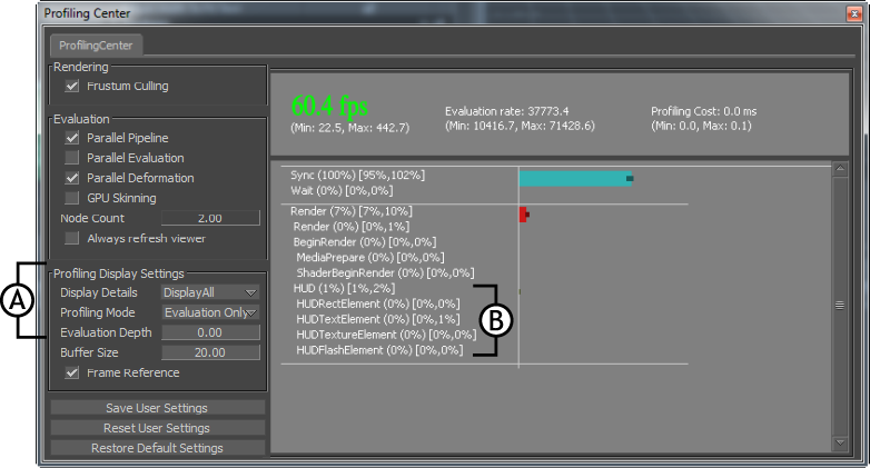 Profiling Center window A. Settings to display HUD and its elements B. HUD and added element types