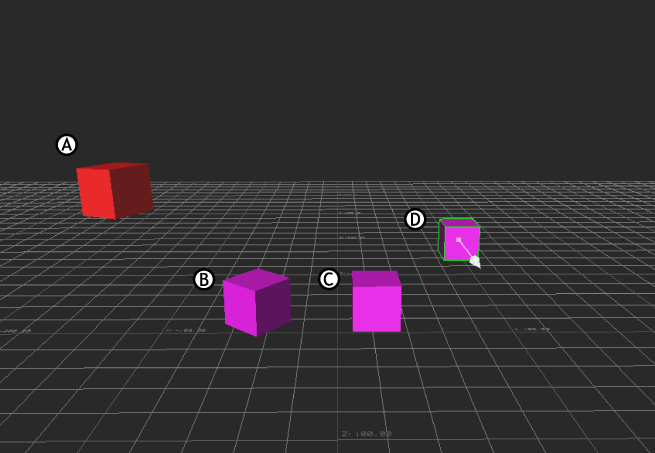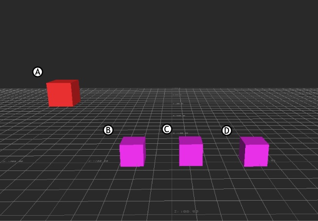 In the following graphic, the cube A is the constrained object. When you move any of the three cubes (the sources) after the constraint is active, the X, Y, and Z rotation of the constrained object changes.