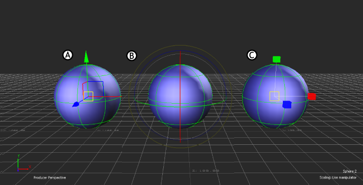 Transformation handles on a sphere A. Translation B. Rotation C. Scaling