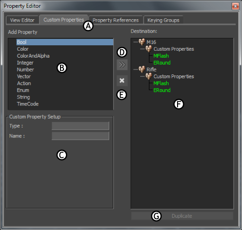 Properties Editor A. Custom Properties pane B. Add Property area C. Custom Property Setup area D. Add button E. Remove button F. Destination area G. Duplicate button