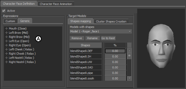 The Generic pane in the Expressions area displays a basic set of facial expressions used to connect the Character Face with an Actor Face.